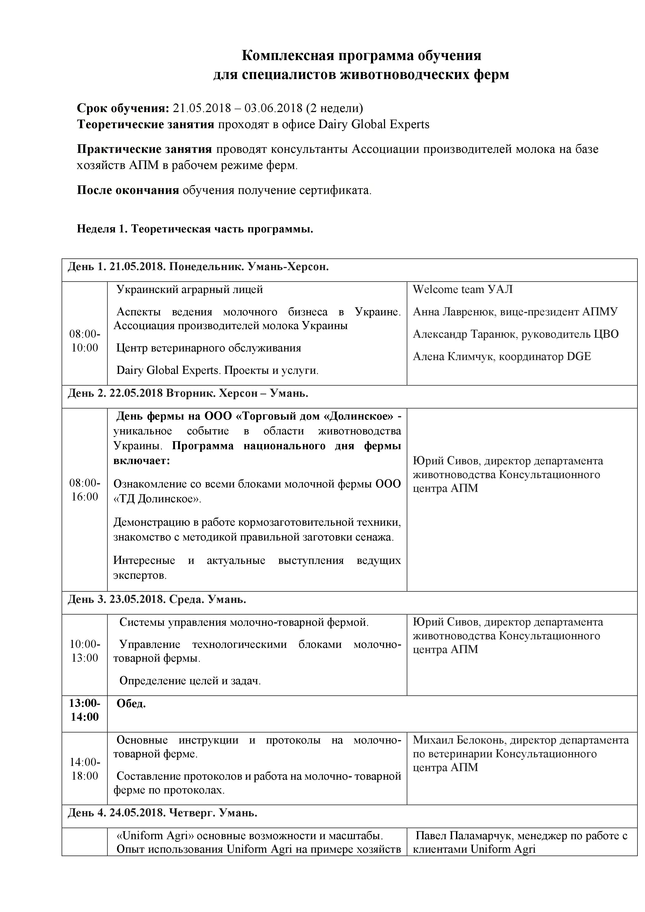 С 21 мая по 3 июня 2018 года приглашаем Вас в Украину на комплексные учебные курсы для управленцев и специалистов животноводческих ферм с целью повышения своей квалификации и получения информации о системах управления молочно-товарной фермой и новых методах в ветеринарии и зоотехнии.